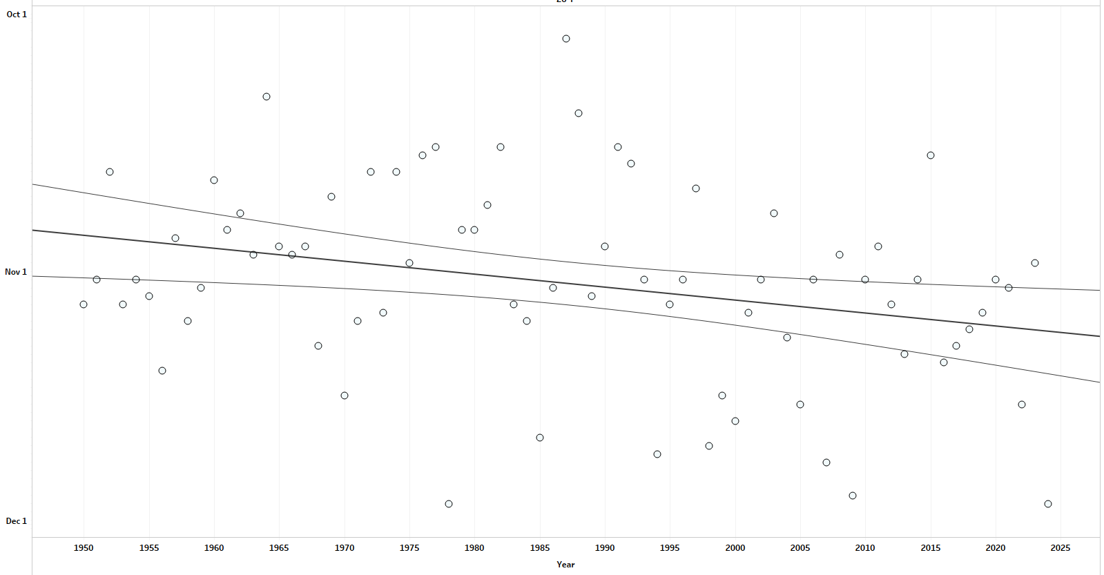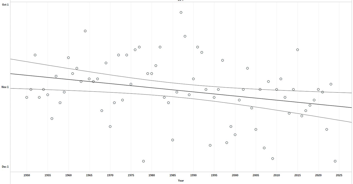 Data since 1950 show that the date of the first hard freeze has been trending later.
