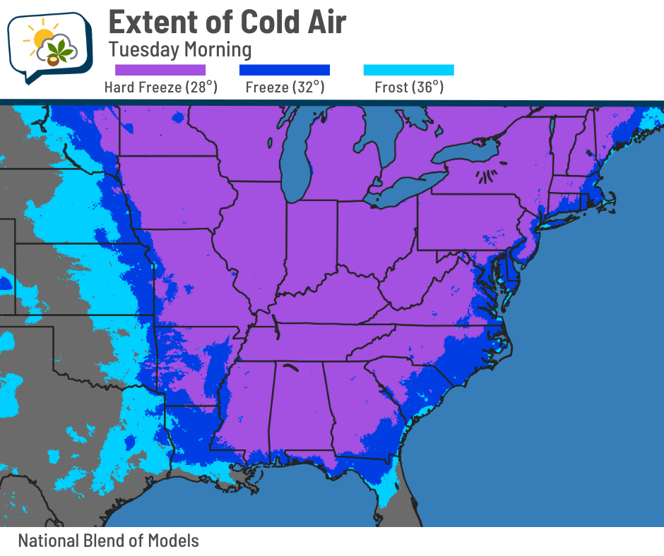 A hard freeze (28 degrees or colder) is expected to reach all the way to about the Gulf Coast. Record lows will be challenged across parts of the Southeast.