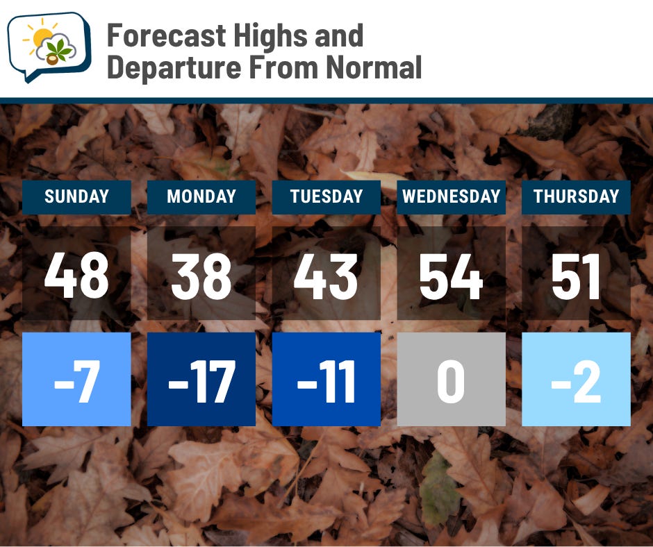 Monday’s going to be downright cold. A high of 38 — which is 17 degrees below average — will be accompanied by enough wind to keep feels-like temperatures in the 20s. It’ll be more typical of early January than early November.