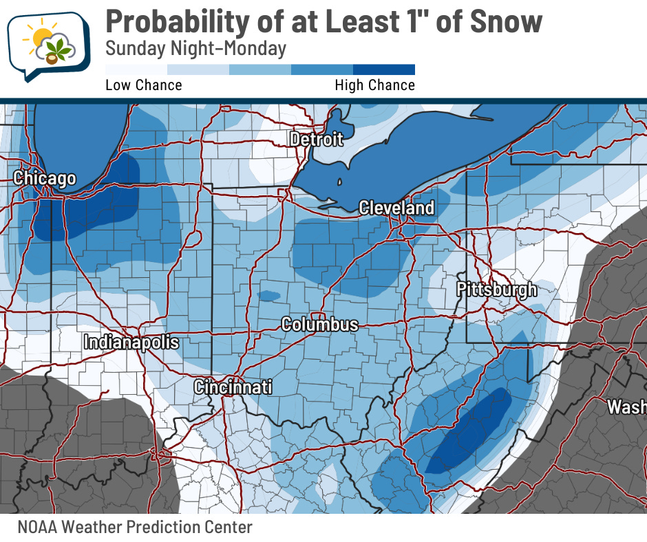 Below is the map of the Weather Prediction Center’s odds of getting at least an inch of snow from tonight through Monday. In the Columbus vicinity, it’s around a 60–70% chance… but that’s in total, and there’ll be melting to contend with. There’ll probably be less than that on the ground at any given time.