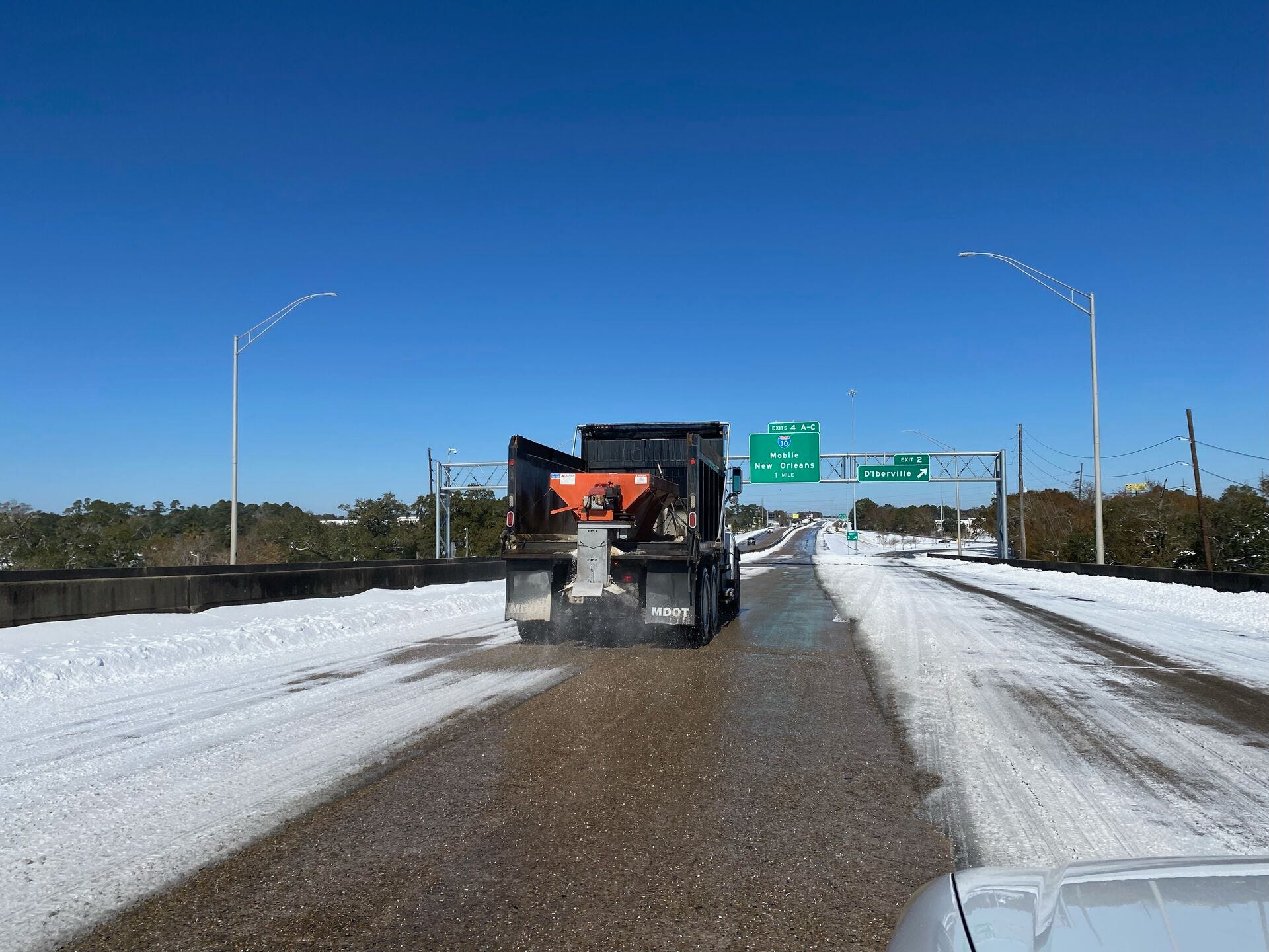 You can see the difference from this photo from the Mississippi Department of Transportation. The overpass they’re on still has snow covering some of the lanes, but if you look farther up the highway, more of the pavement is clear.