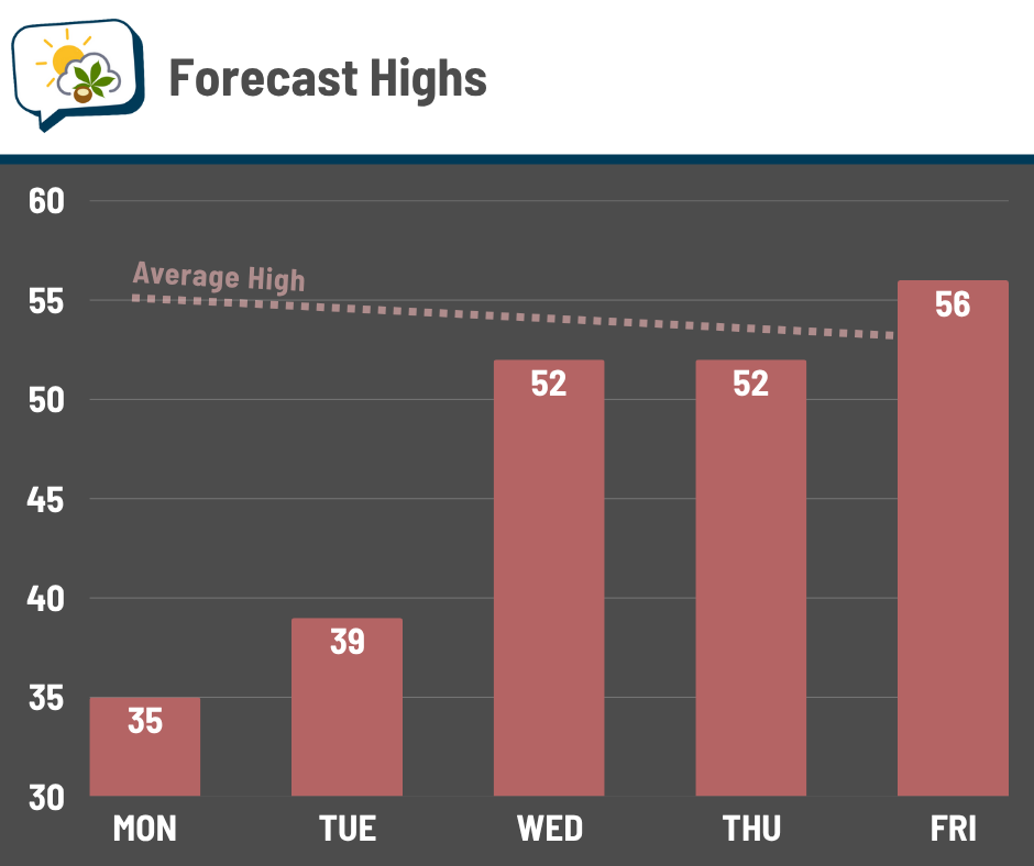 What does this mean for us? The next couple of days will be chilly, to be sure, but highs quickly rebound back into the 50s for the second half of the week.
