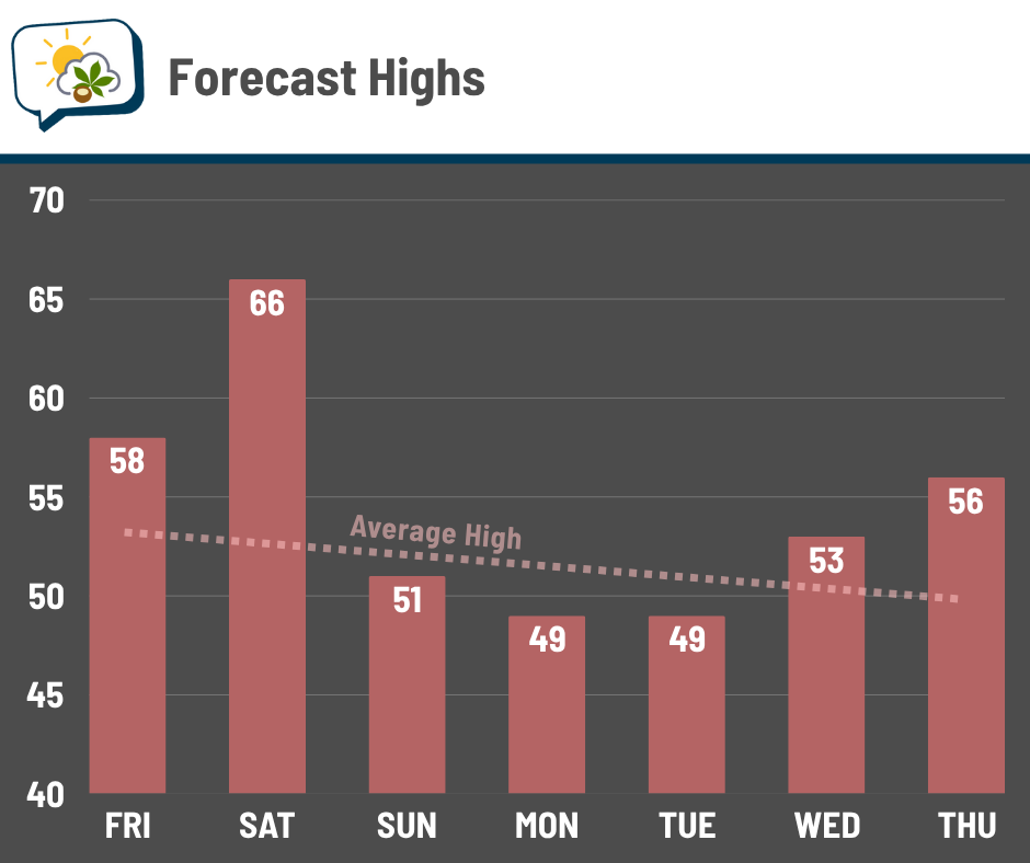 Gusty southwest winds will help drive the warmup. But the cold front timing allows cooler air to pour in with plenty of time for Sunday, so northwest winds into Sunday drop things right back down. Lower 50s will be about all we can muster, even with sunshine.