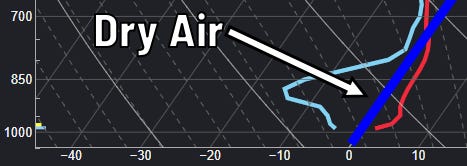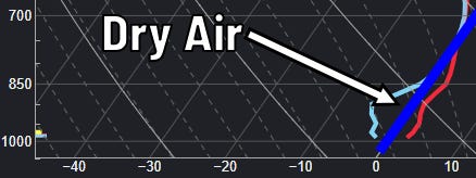 You’ll notice the temperature is also to the right of, or warmer than, freezing for most of those 10,000 feet. Above freezing for that amount of atmosphere = too warm for snow, if there were to be any precipitation.