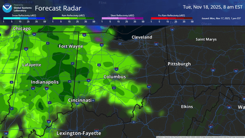 Let’s go forward a few hours to 8 a.m. That dryness has eroded somewhat as the shield of precipitation continues spreading into central Ohio, and the temperature aloft has cooled a little, too. But it’s still above freezing, so still rain.