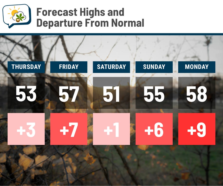 Biting cold isn’t in the cards in the near future. Highs will be near to above average straight into next week.