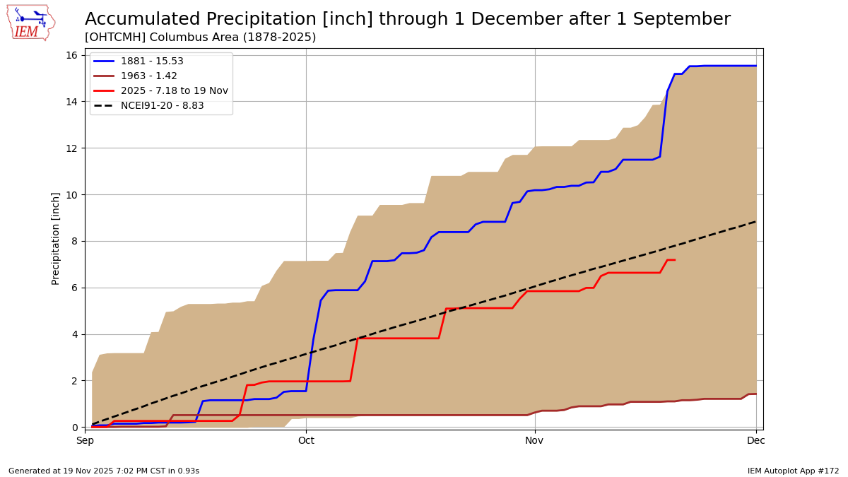 So far, we’ve had 7.18” of precipitation this fall. The wettest was 1881, which had a total of 15.53”. You can see it had a couple of big spikes in early October and again in mid-November. 1963 had the driest fall with just 1.42″.