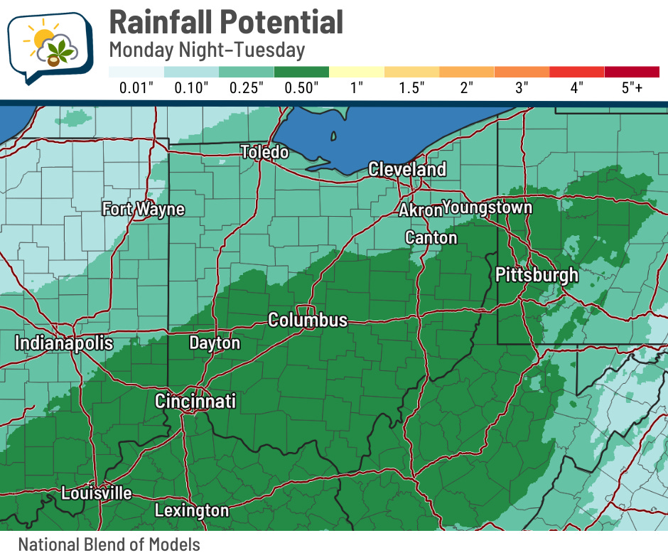 Rainfall amounts could top a half-inch as the slug of moisture comes up from the southwest.