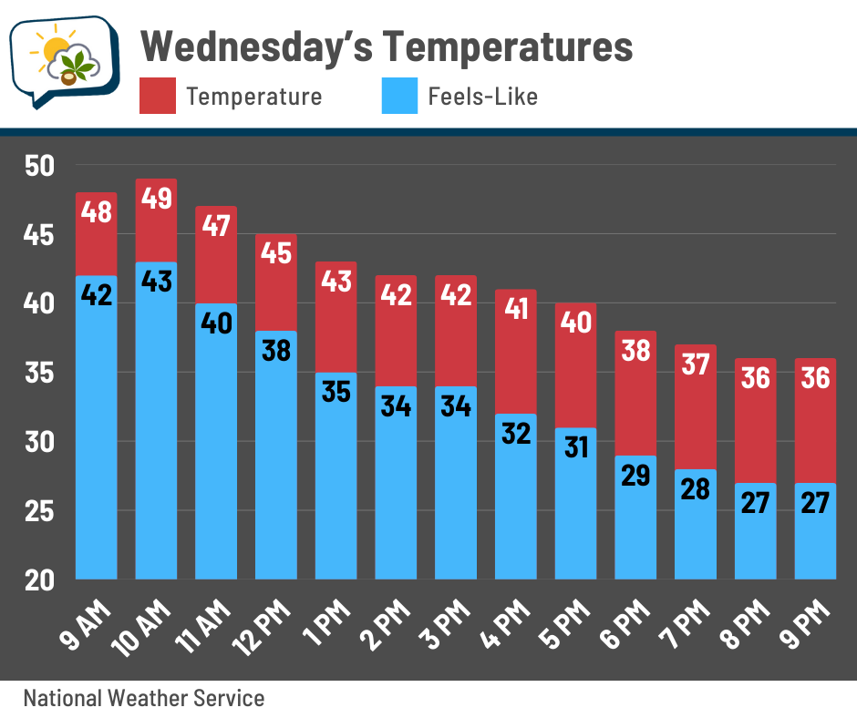 Tomorrow’s high will be near 50, but it’ll happen in the morning. Temperatures fall a good share of the day. Wind chills drop into the upper 20s in the evening.