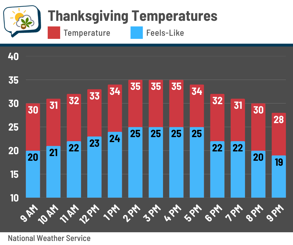 Unfortunately, wind chills won’t even make it out of the 20s on Thanksgiving. Mid-20s will be about all we can muster up for the feels-like temperature, with actual readings only making the mid-30s. That’s a little more than 10 degrees below normal.