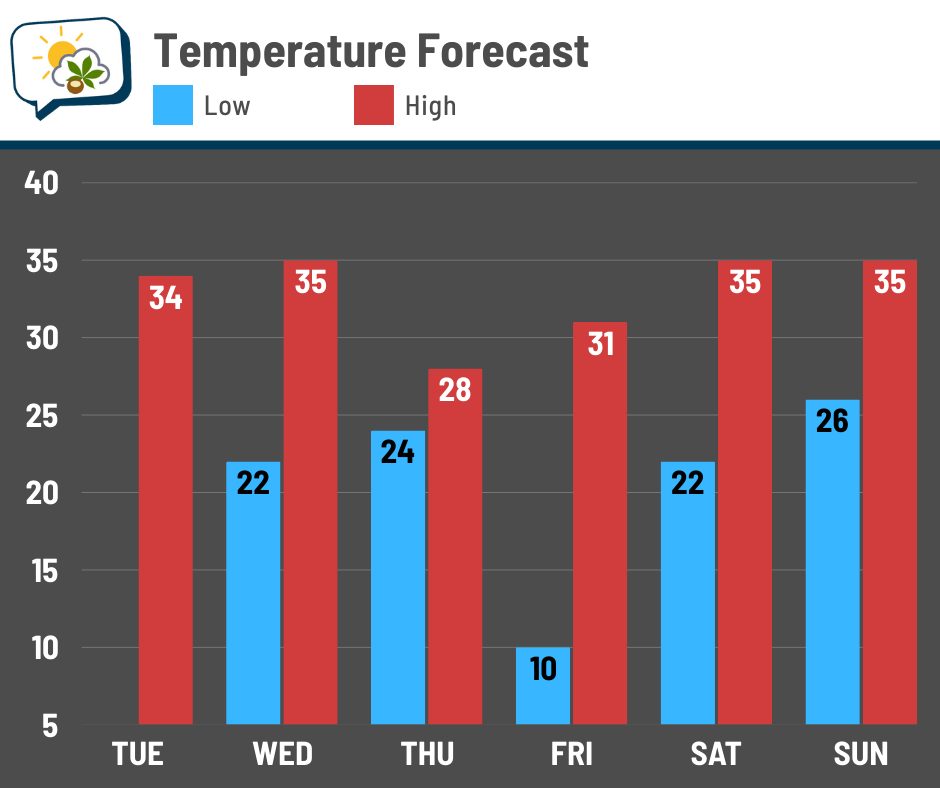 Coolest high: 33° on the 10th