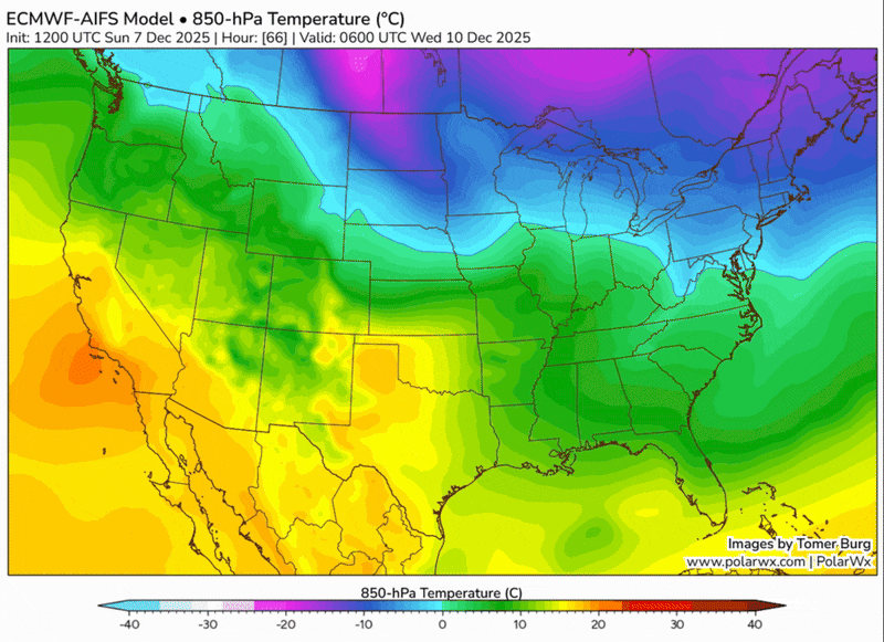 Here’s a check of temperatures aloft from the AI flavor of the European model. We’ll start Tuesday night, when relatively mild air sneaks in ahead of the shower-producing system. Cooler air comes in behind it, but you can see purples and pinks lurking farther northwest that dive our way for the weekend.