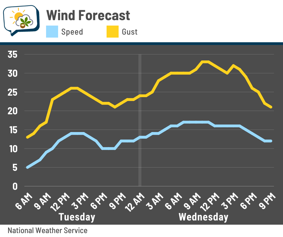 The wind will also be a thing with the midweek system. Here’s the forecast wind speed and gust Tuesday and Wednesday. Blustery conditions peak on Wednesday as gusts should top 30 mph. Even though that’ll be our warmest day this week, the wind will make it feel more brisk, especially since there’ll be some dampness.
