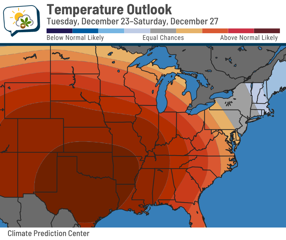 In fact, most days coming up feature above-freezing highs, including multiple 40s next week. The Climate Prediction Center’s temperature outlook for next week has us in pretty good odds of above-average temperatures, overall.