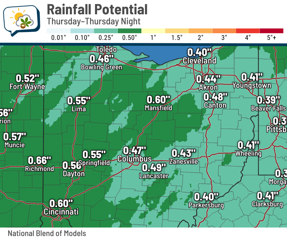 Most of Thursday will be dry. A few showers could develop in the afternoon, but it really looks like the bulk of the rain will be in the evening through early overnight hours — say, roughly 6 p.m. to midnight.