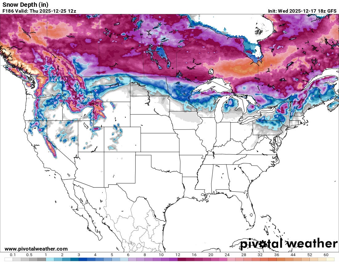 Only the places you might expect have a good shot at having snow on the ground in a week. Here’s the forecast snow depth from the main American forecast model; the European model is similar.
