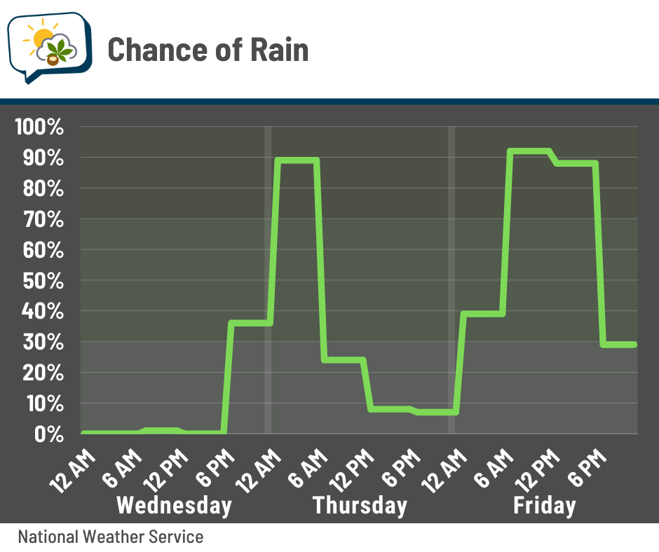 That first rain chance is still mainly a nighttime event, so no biggie there. The second one has shifted toward the daytime hours Friday. Shouldnāt be a heavy rain, but if youāll be out and about, plan on wet roads and having an umbrella or putting your coat hood up. Sundayās timing is a bit uncertain, as itāll depend on when the front blasts through.