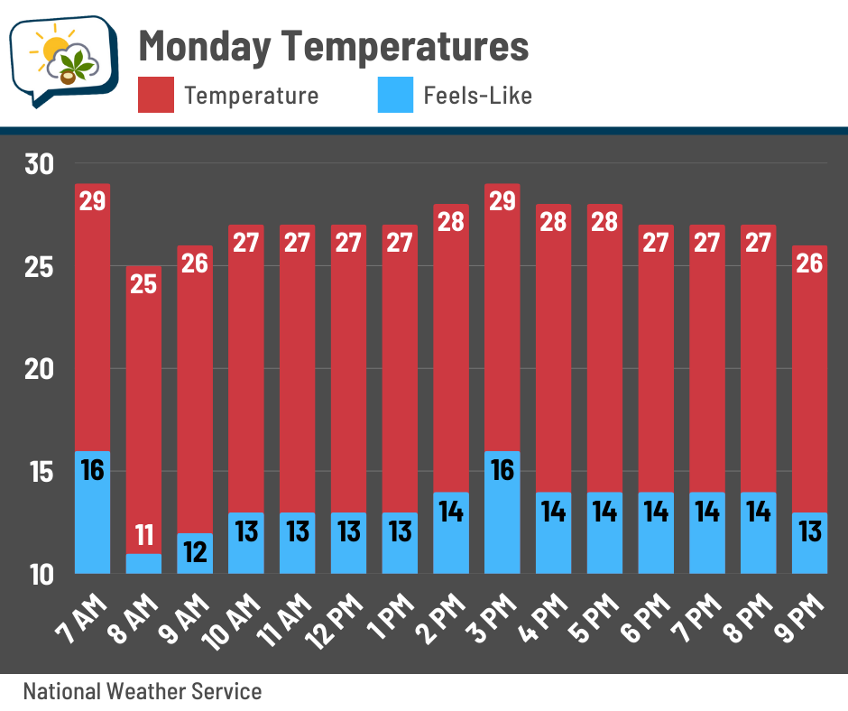 By the time most of us get going for the day, readings will be around 30 and should drop a little further before leveling out in the upper 20s. The wind will make it feel even colder.