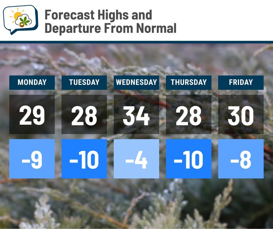 This week features below-average temperatures, with a couple of days probably stuck in the upper 20s.