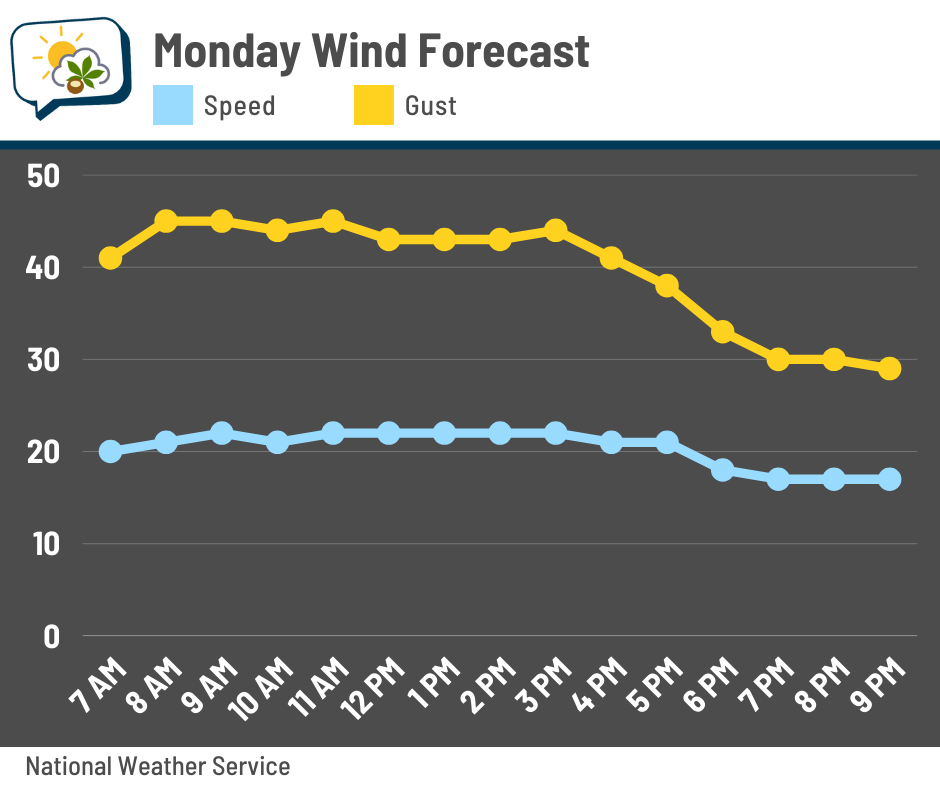 Winds pick up ahead of the Sunday night cold front, and boy will they be up there straight into Monday. Sustained winds will be around 20 mph, and gusts should top 40 mph from time to time.
