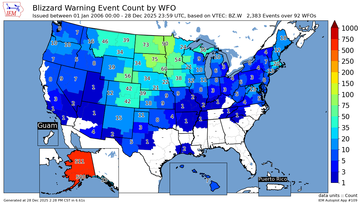 Going back to January 1, 2006, the Wilmington NWS office has issued just three blizzard warnings. Meanwhile, the Des Moines office has issued 38, and Grand Forks has issued 90! You can see a clear geographical pattern on this map.
