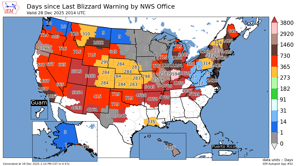 My wife’s family in northern Iowa is currently in their second blizzard warning of the season. Meanwhile, the Wilmington National Weather Service office (which covers the Columbus area) hasn’t issued a blizzard warning in over a dozen years.