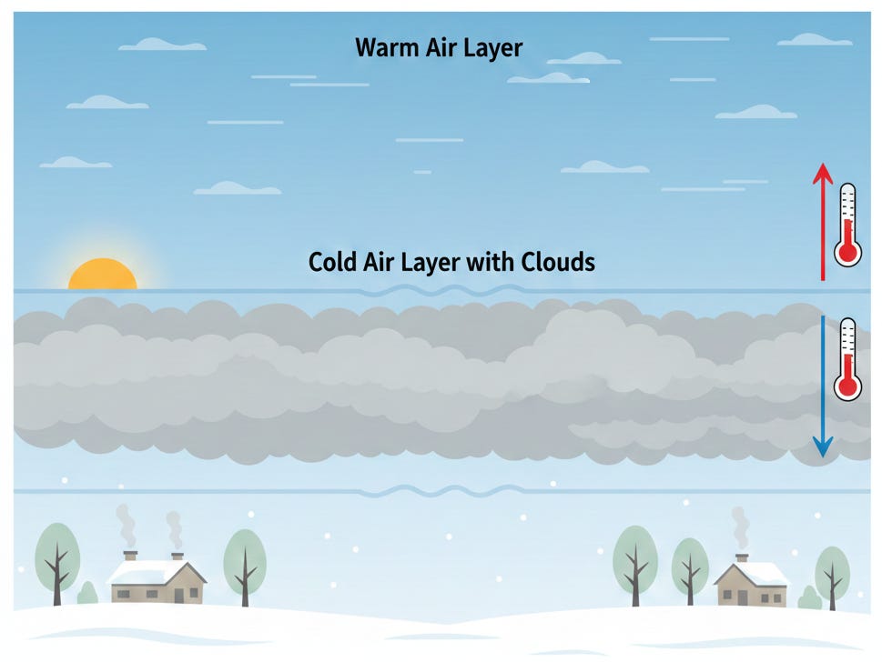 A temperature inversion happens when warmer air sits atop cooler air. Typically, the reverse is true; warmer air is near the surface, rises upward, and cools. That also allows the air to mix around.