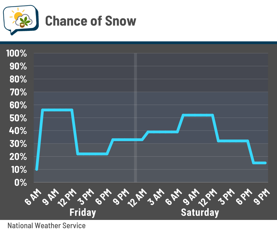 There’s an off-chance of a few straggler flurries early Thursday, but the main focus on snow will be Friday and Saturday.