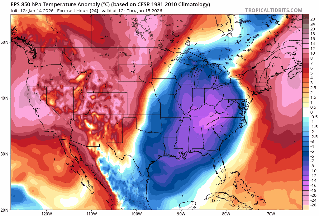 Anytime you see big blobs of blue and purple on a temperature anomaly map (this one for temperatures about a mile above our heads), you know it’s gonna be cooooold.