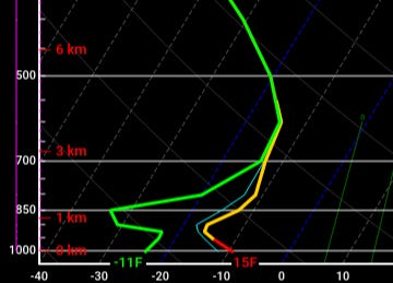 This is a forecast sounding for 4 p.m. Saturday, showing what a weather balloon would indicate if it were launched at that time and the model was right. Left is lower temperatures, right is higher temperatures, and there’s a big gap between the dew point (green) and temperature (red/yellow). Yes, things are saturated aloft, but there’s gobs of dry air below it.