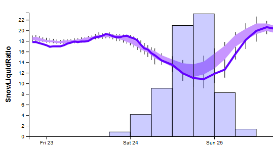 The line graph below is the National Blend of Models’ expectation for snow-liquid ratio (ignore the bar graph). You can see that it dips down, indicating a shift from fluffy flakes to somewhat wetter snow (higher ratios are fluffy snow, lower ratios are wetter snow). But I don’t think we’ll get into snowball-snow consistency.