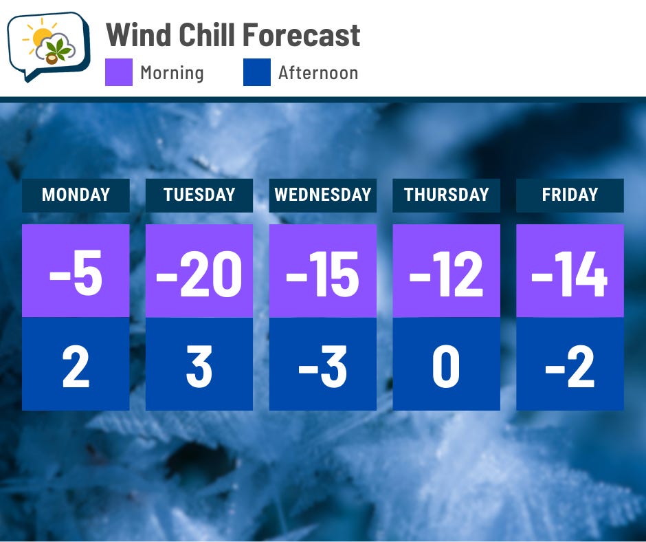 Schools have already called off Monday, of course. And wind chills will be well below zero every following morning this week. And afternoon wind chills won’t feel much better.