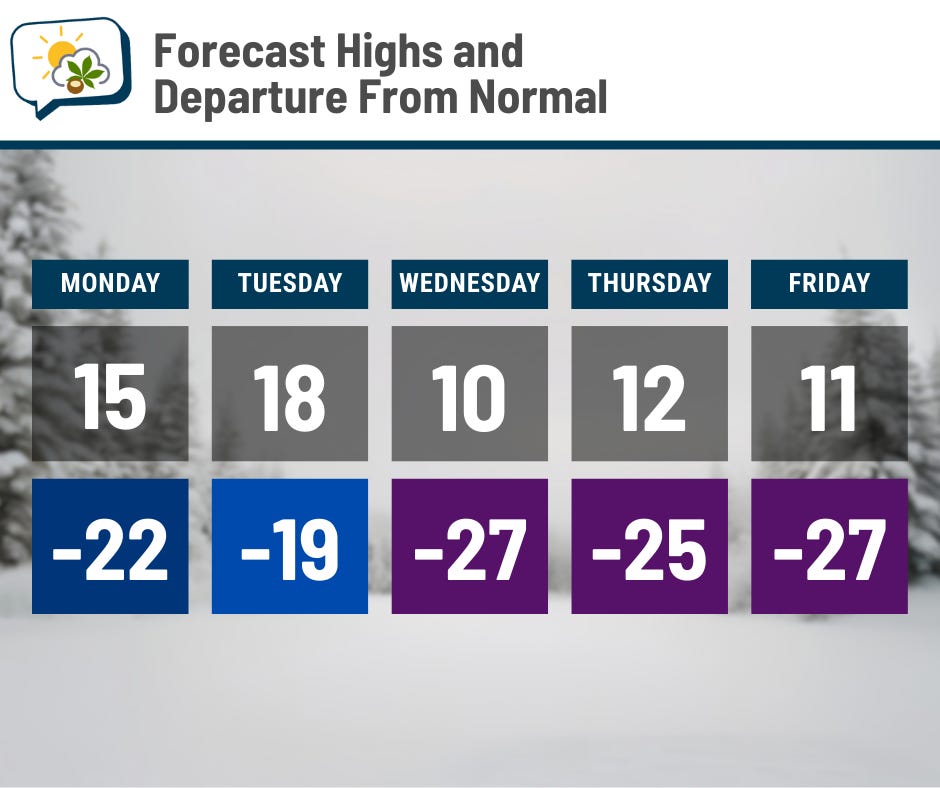 Highs should be stuck in the teens all week, way below average. Morning lows dip below zero, too; record lows are in play at the end of the week.