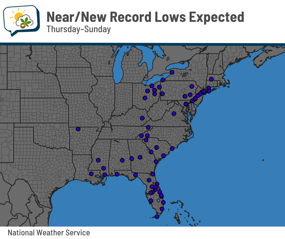 Below is a map of near or new record lows that are expected Thursday through Sunday. Columbus shows up because Saturday morning’s record low of -6° (set in 2004) is in play. I’ll add that the record cold high of 10° (1971) isn’t totally safe, either.