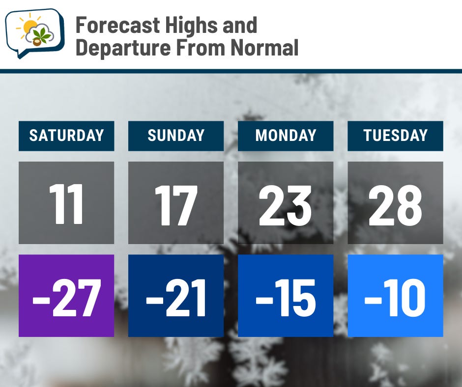 We ought to have four more days with highs in the teens, but barely so on Saturday. Lows fall to near or a bit below zero Thursday morning, Friday morning, and Saturday morning.