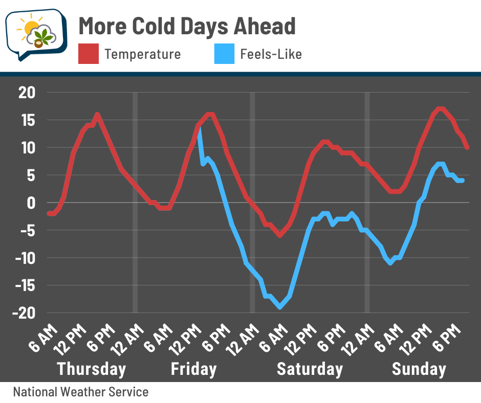 I bring a little good news with feels-like temperatures: winds will be light on Thursday through Friday morning, so the wind chill will basically match up with the actual temperature (which is why you don’t see the blue line during those times in the graph above).