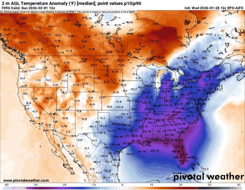 Yes, temperatures do slowly moderate after the weekend, but should stay below average until late next week. Here’s an animation of the AI flavor of the European forecast model ensemble Sunday through Saturday. Don’t worry about the numbers, just note the decreasing Purples and Blues of Doom.