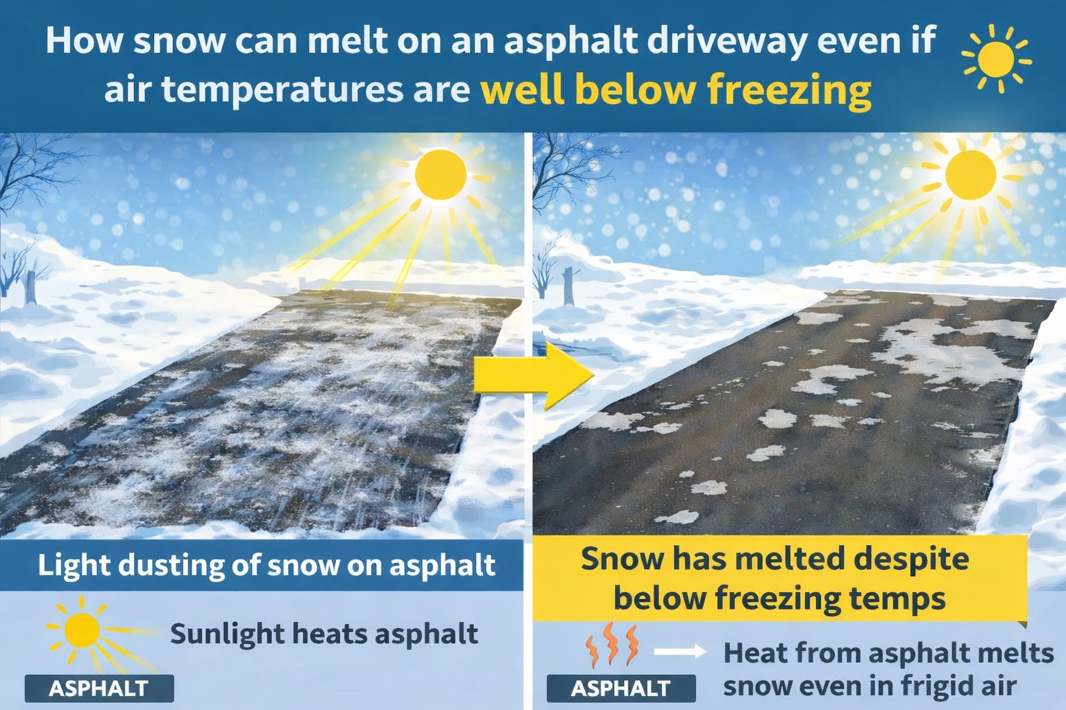Ah, the power of objects absorbing sunlight. Some of the dark asphalt was exposed, so when the sun came out, it absorbed the sunlight (in the form of shortwave radiation) and warmed up enough to melt the snow.
