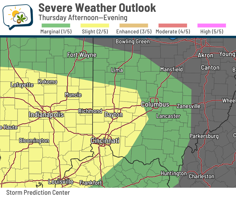 You may be aware that parts of Ohio, including us, are in a severe weather risk later Thursday. Whether we get that here really depends on if there’ll still be enough energy for robust storms. There’s plenty of shear — winds changing direction and speed with height — but the big question is whether their timing will overlap here.