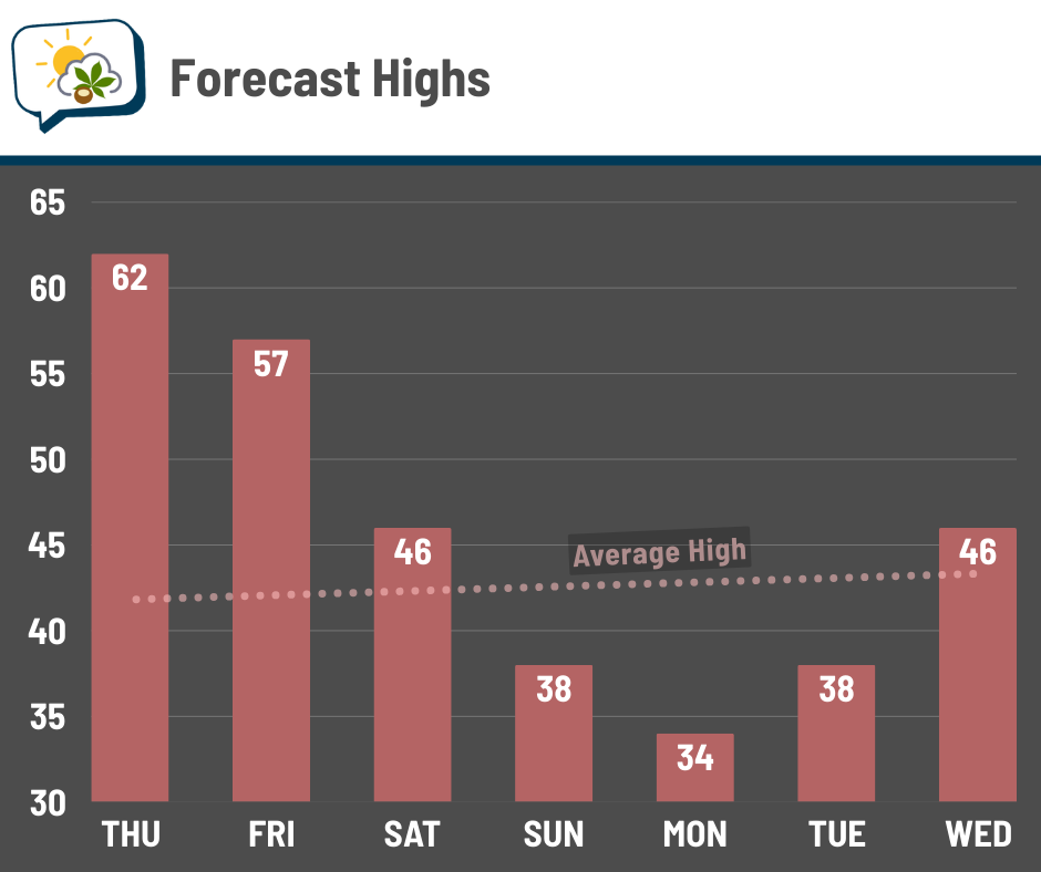 We have one more day in the 60s, then the cold front responsible for Thursday evening’s rain/storms comes through. Temperatures probably won’t move much on Friday, but hey, they’re still in the 50s.