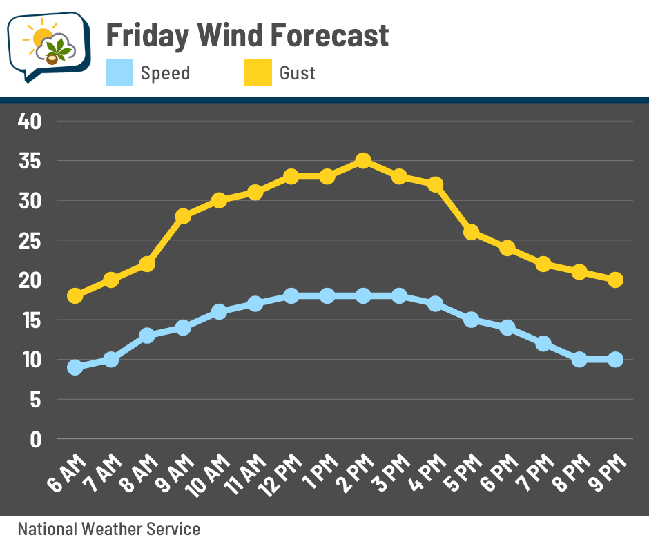 I’ll also add that winds will be stiff on Friday in the wake of the cold front. Gusts will top 30 mph from late-morning into most of the afternoon.