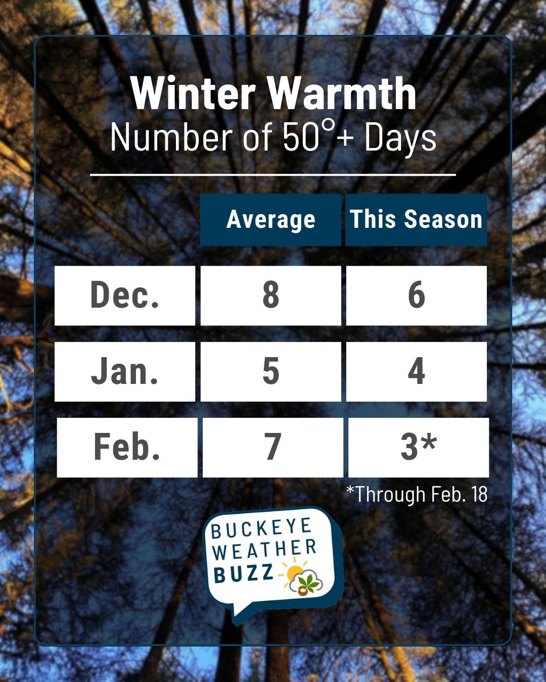 December and January came up just a touch short of the 1991–2020 monthly averages for the number of days hitting at least 50°, but they were still within a typical range.