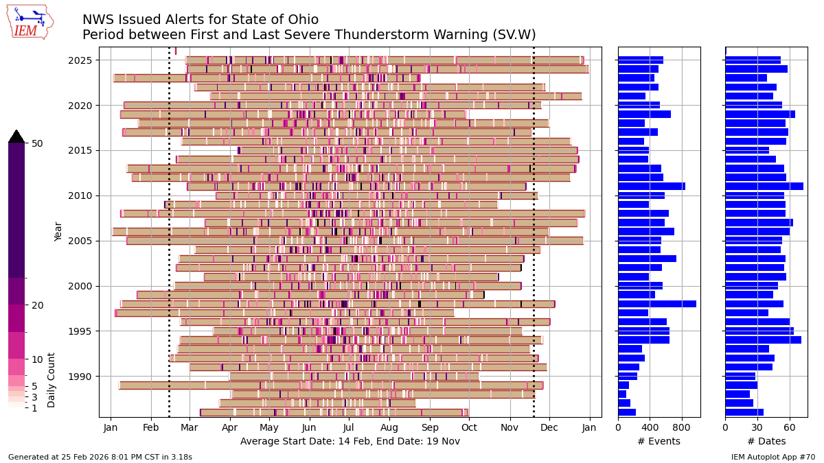 This plot shows the period between the first and last severe thunderstorm warnings of the year in Ohio, going back to 1986.
