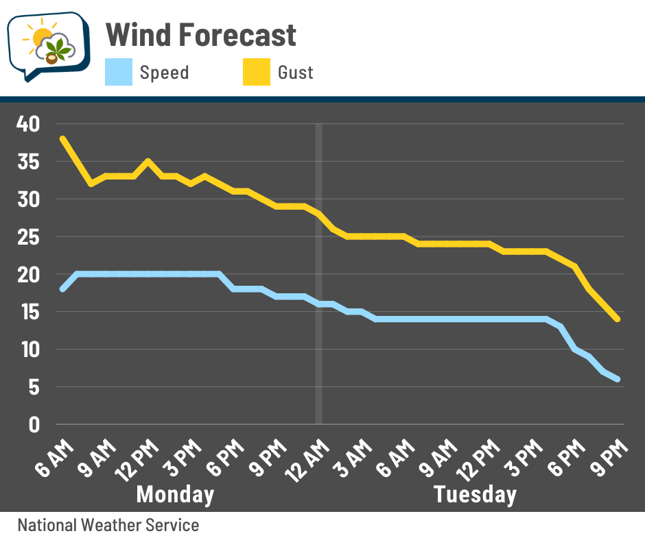 While the winds aren’t nearly as strong as they were on Friday, thank goodness, they’re still up there overnight into Monday. They’ll gradually back off during the day Tuesday.