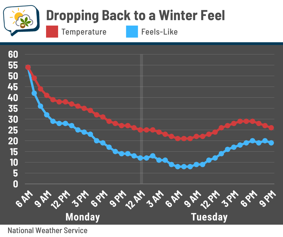 That cold front means business with temperatures. Early risers may catch the very fleeting 50s, but most of us will be heading out the door when temperatures have fallen to the 40s… and they’ll continue slipping from there, dropping into the 30s before lunchtime.