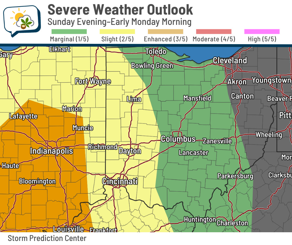 A powerful cold front is on track to blast through a few hours before daybreak Monday morning. It’ll bring a line of rain/storms along with it, probably around 3–4 a.m. in the Columbus area.